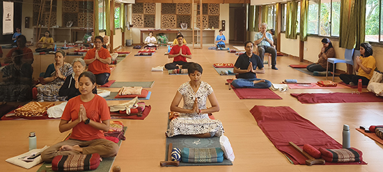 The participants are guided through specific āsanas that stabilize the body and prepare it for meditative stillness.